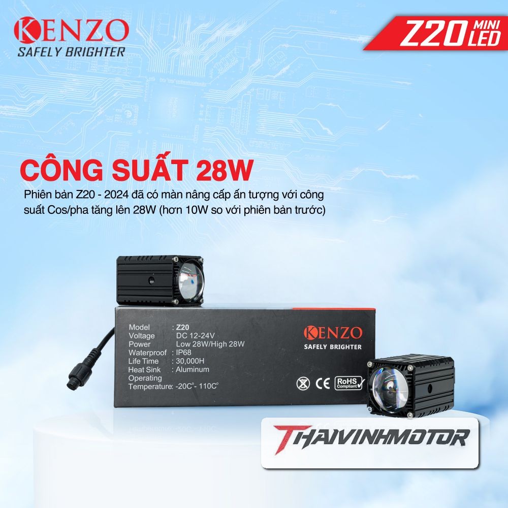 Bi LED Mini Kenzo Z20 – siêu gọn, siêu sáng, dễ lắp cho mọi dòng xe máy. Công suất 28W, ánh sáng gom tốt, pha-cos rõ nét, tản nhiệt thông minh, bền bỉ. Gắn zin, không chế cháo – phù hợp Wave, Sirius, Exciter, Winner, Vario, Vision, SH, Vespa, ADV… Giá chỉ 700K/bóng!