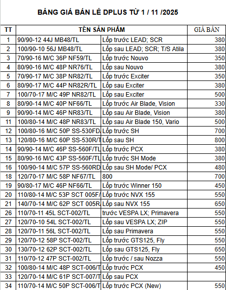 Lốp Dplus là thương hiệu được nhiều khách hàng tại Đà Nẵng tin chọn nhờ độ bền cao, khả năng bám đường tốt và giá thành hợp lý. Với hơn 30 mẫu thông dụng, Dplus đáp ứng hầu hết các dòng xe phổ biến như SH, PCX, Air Blade, Vision, Exciter, Vespa… Tại ThaiVinhMotor Đà Nẵng, bạn có thể thay lốp Dplus chính hãng nhanh chóng, an toàn và được bảo hành đầy đủ.